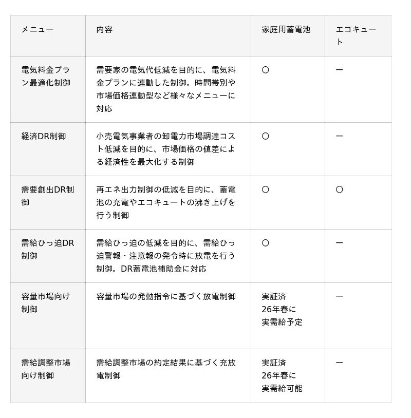 [表2: https://prtimes.jp/data/corp/168657/table/23_2_23d0b119780b264fbcef63b915688c61.jpg?v=202512231115 ]*1 Virtual Power Plant(仮想発電所):分散する電源(発電設備、蓄電池、EVなど)や需要設備をあたかも一つの発電所のように集合制御するデジタル技術の総称。