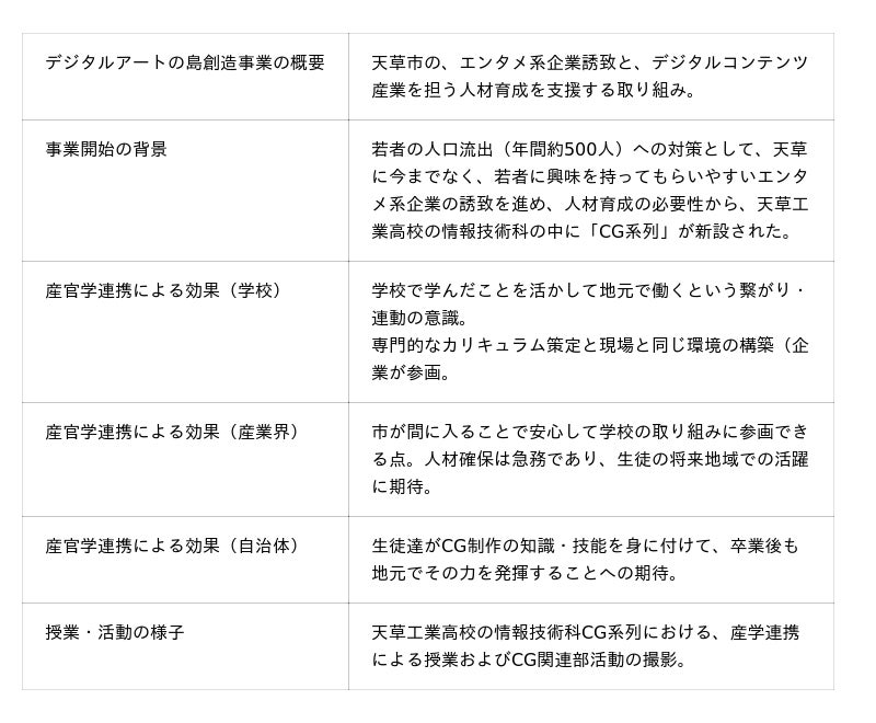 本動画は、専門高校における効果的な産学連携のあり方やノウハウを全国に共有することを目的としており 、当社がデジタルアート天草を通じて参画する、熊本県天草市の「デジタルアートの島創造事業」による、天草工業高校情報技術科CG系列での人材育成の取り組みが取り上げられます。