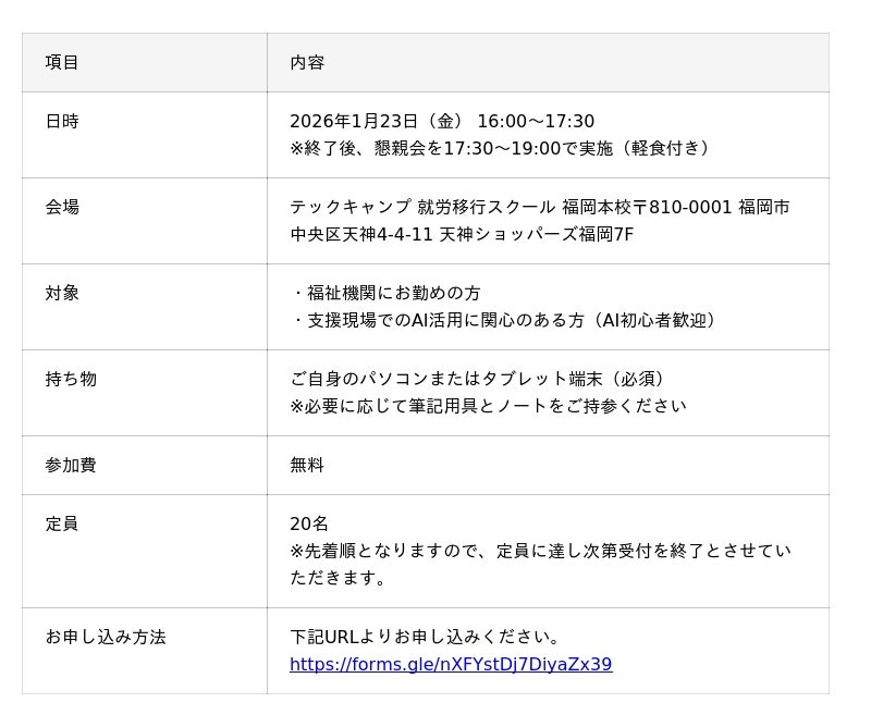 プログラミングスクール「テックキャンプ」を運営する株式会社div(本社:東京都港区、代表取締役社長:石原 圭)は、福岡市周辺地域の障がい福祉機関で働く方々を対象として「生成AIを活用した福祉業務の効率化セミナー」を、2026年1月23日(金)に開催いたします。