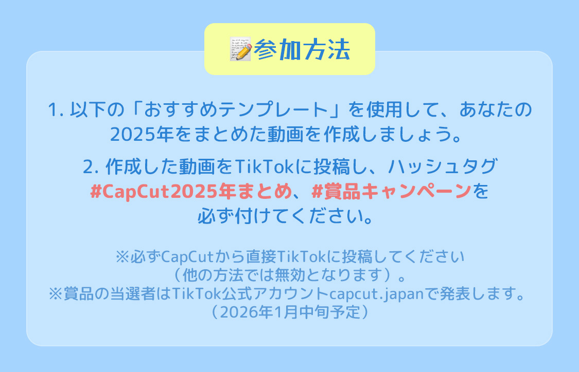 「おすすめテンプレート」を使用し、ハッシュタグ「#CapCut2025年まとめ」「#賞品キャンペーン」を付けて、CapCutからTikTokに投稿