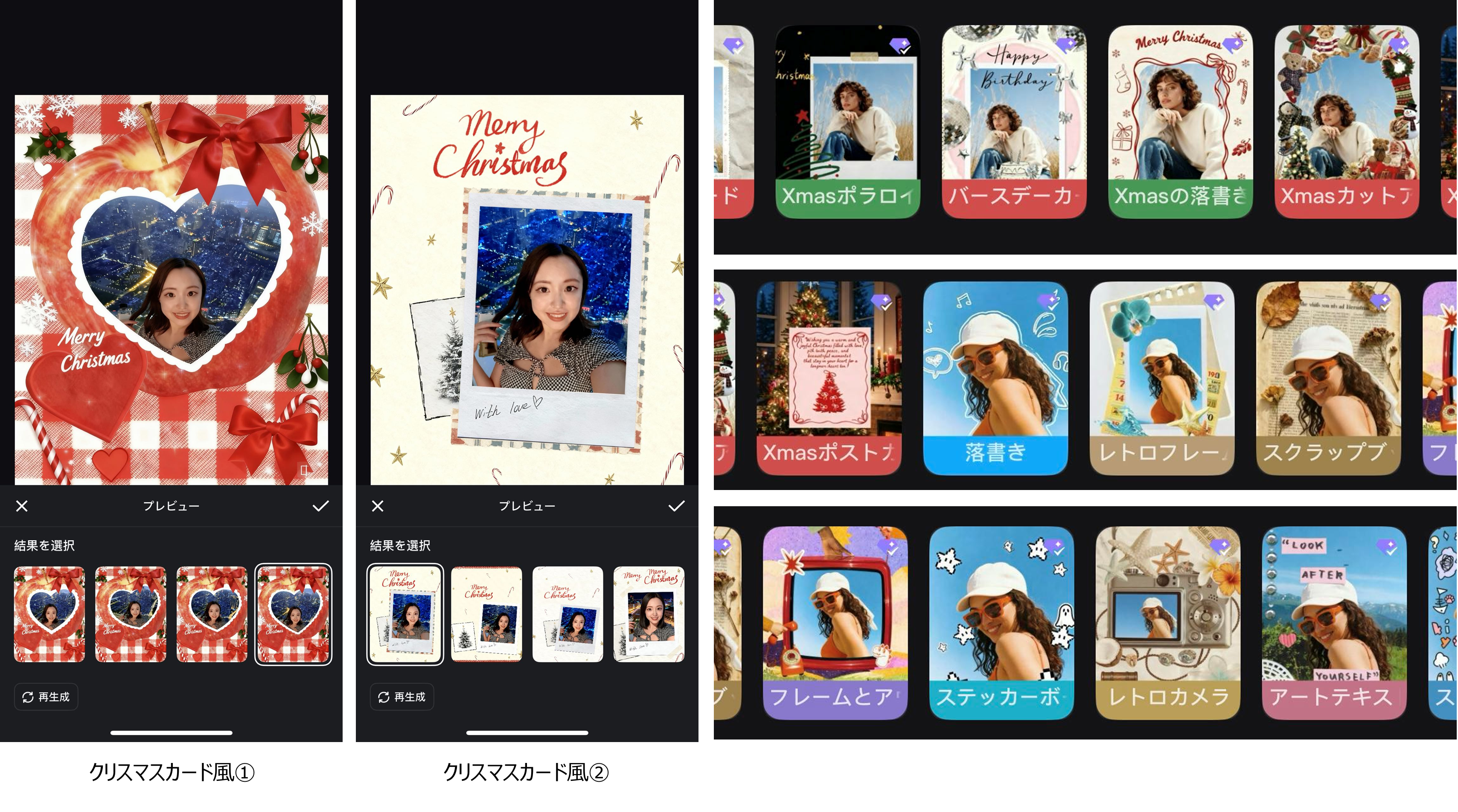 さらに、2025年11月28日(金)より、AI技術を活用して自動で写真を認識し、スタイリッシュなコラージュを作成する機能「写真スタイラー」の提供を開始しています。写真と好みのスタイルを選ぶだけで、自動で最適なデザインを提案し、コラージュを生成します。クリスマスカード風やプリクラ風、落書き風のフレームなど、多彩なスタイルを用意しており、季節のイベントや記念日の写真編集にも活用することができます。