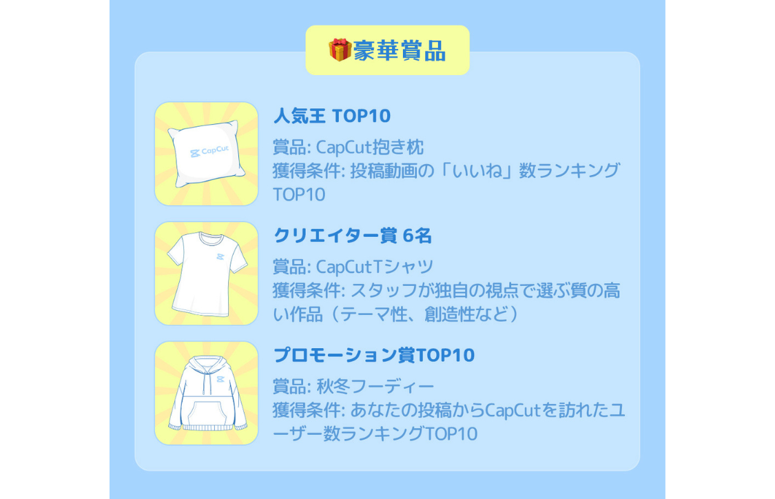 - 賞品:抽選で、CapCutオリジナルグッズなど豪華賞品を進呈