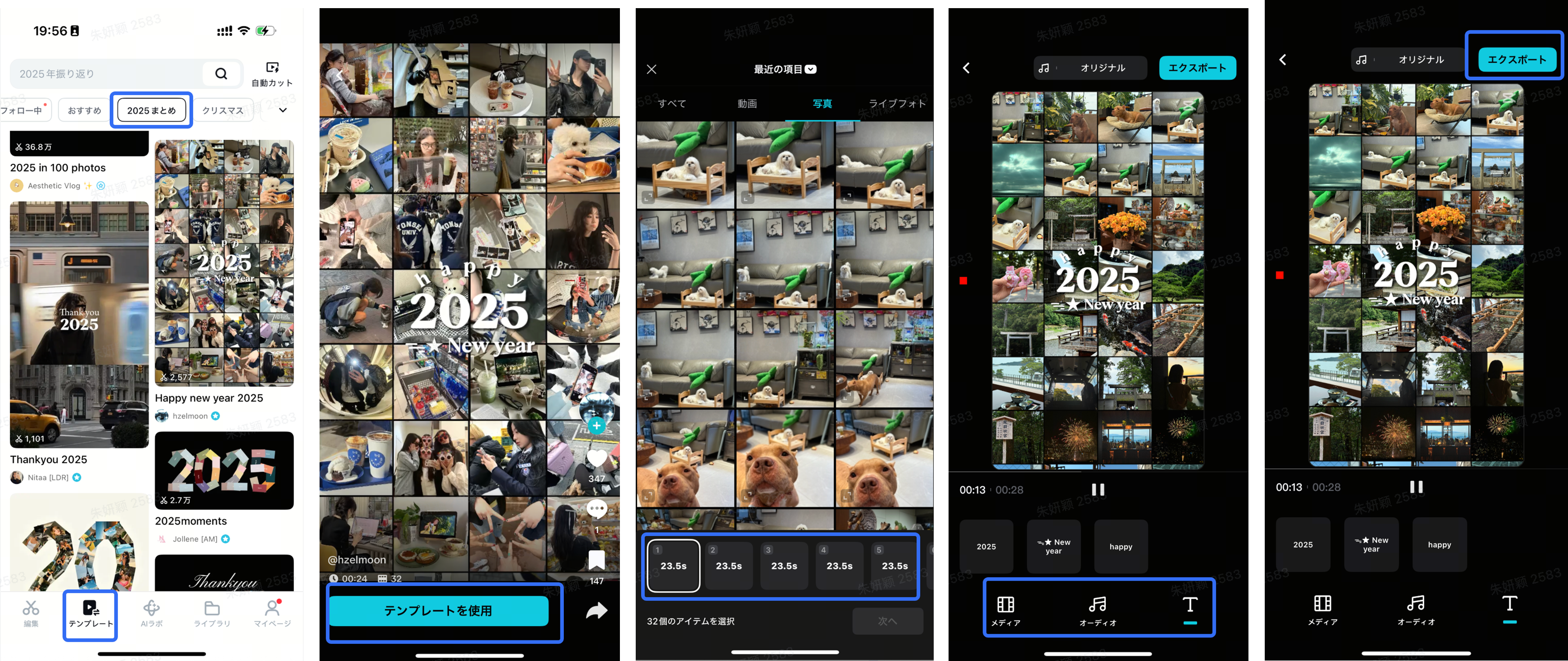 テンプレート ▶ 2025年まとめ ▶ テンプレートを使用 ▶ 写真・動画を選択 ▶ 微調整 ▶ エクスポート
