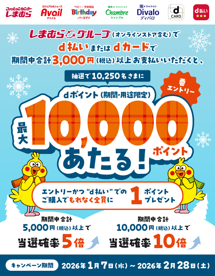 株式会社NTTドコモ(以下、ドコモ)は、しまむらグループにおいて「d払い、dカード利用でdポイント最大10,000ポイントあたるキャンペーン(以下、本キャンペーン)」を2026年1月7日(水)から2026年2月28日(土)までの期間で開催いたします。