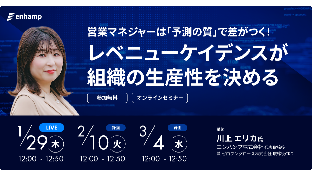 株式会社パワー・インタラクティブは、無料ウェビナー『営業マネジャーは「予測の質」で差がつく!レベニューケイデンスが組織の生産性を決める』を、1月29日にライブ開催、2月10日、3月4日に録画配信を行います。