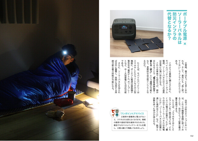 さらに後半では、自宅で行う防災キャンプ、野外で行う災害想定のソロキャンプを筆者自ら実践し、技術・知識・経験・準備のポイントを具体的に紹介している。