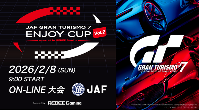 JAF九州本部(本部長 金野誠)は2026年2月8日(日)、REDEE株式会社(代表取締役 密山裕貴)と協働でEモータースポーツイベント「第2回JAF GRAN TURISMO 7 ENJOY CUP」を開催します。