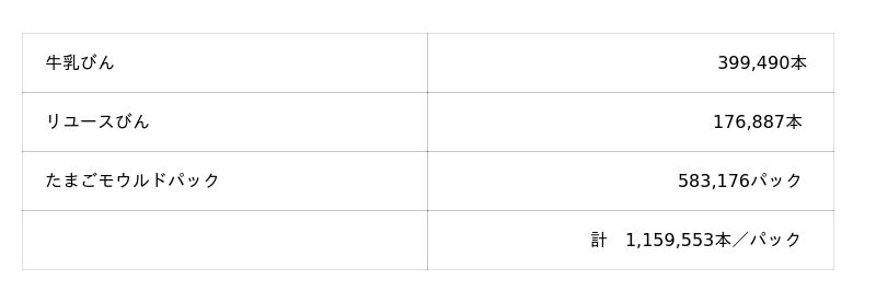 l 再使用・回収された容器・資材の総量:約1,159,000本・パック、約345トン