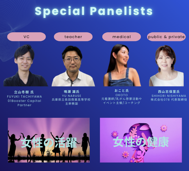 株式会社100(ワンダブルオー)は、2023年3月7日に京都にて創業し、「1億総”健幸”社会」の実現を掲げ、次世代がん検査サービス「NCT(new generation cancer test)」の社会実装を目指し、乳がん検診受診啓発活動からスタートしました。その後、活動の幅を広げ、女性のヘルスリテラシー向上を目的として、「FEMTECH&(R)」というコンセプトブランドを立ち上げ、フェムテック×防災、お茶、公園、多様性など、様々なコラボレーションの取り組みを行政、民間企業、教育機関、有志団体等と連携しながら行ってまいりました。これまでの3年間の集大成の場として、将来を担う現役高校生と女性の健康に関する実態調査を行い、課題に対する解決策について発表する場を企画しております。未来のヘルスケアのあるべき姿について、高校生ピッチ、パネルディスカッション、チャリティーオークション、展示物販、グループワーク(順不同)など、さまざまなコンテンツを通じ、多世代で女性の「健康」、女性の「活躍」について考えを深める機会の創出を目指し、本イベントを開催いたします。