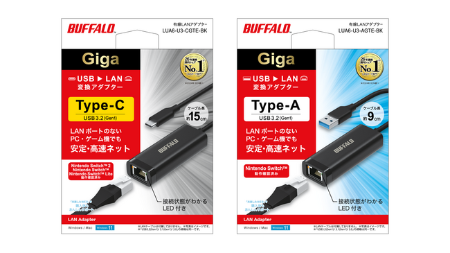 株式会社バッファロー(本社:東京都千代田区、代表取締役 社長執行役員CEO:牧 寛之)は、挿すだけでLANポートのない機器で有線LANを使用することができるようになる有線LANポート(1000BASE-T/100BASE-TX/10BASE-T)を搭載した、USB3.2(Gen 1)対応USB接続の有線LANアダプター USB Type-C対応モデル「LUA6-U3-CGTEシリーズ」と、USB Type-A対応モデル「LUA6-U3-AGTEシリーズ」をそれぞれブラックとホワイトの2色展開で2026年2月上旬より順次出荷、販売いたします。