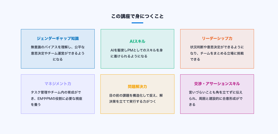 本カリキュラムでは、世界のジェンダー・イノベーション事例を通じて、視点の偏りや欠如がプロダクトの品質・安全性・価値にどのような影響を与えるかを学びます。PMに求められるのは、単なる調整力ではなく、見落とされがちな視点を構造的に捉える力です。女性が陥りやすい内面バイアスや自己効力感の低下を理解し、AIを用いた思考整理によって、自身の視点を価値として扱える状態を育てます。