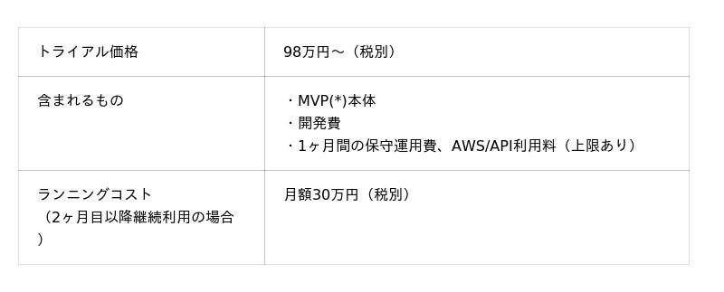 *MVP:価値を提供できる最小限の機能を備えた製品として、AI導入の判断材料としていただけるような必要な機能に絞りこんだ開発成果物となります。