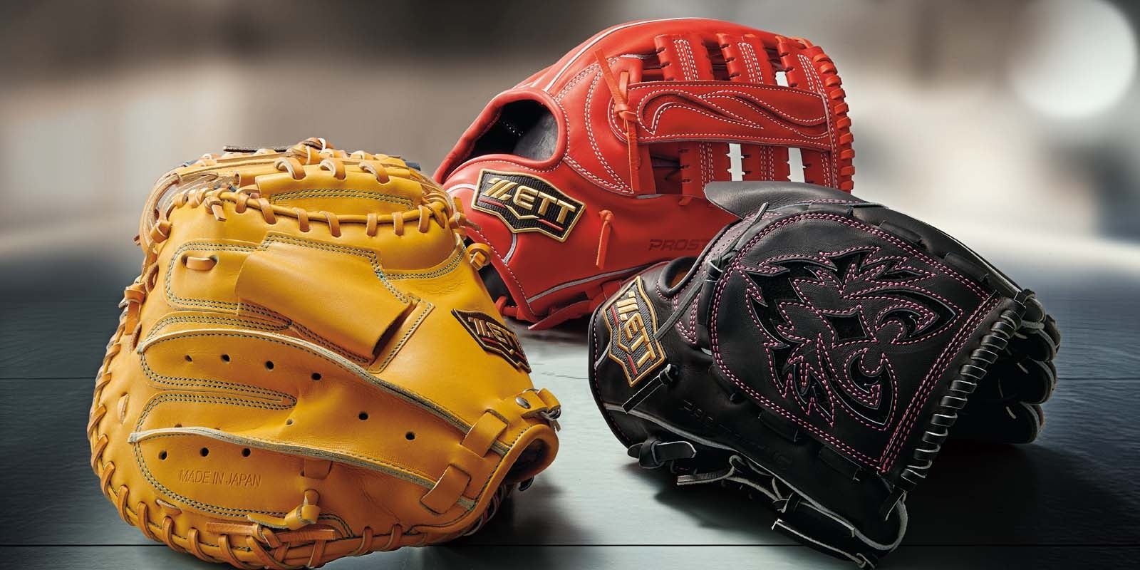 - 使用レザーグラブにはきめが細かくしっとりした質感を持つヨーロッパ産のプロステイタスKIP、ミットには耐久性としなやかさを併せ持つ希少な成牛皮を使用したプロステイタスレザーを使用。