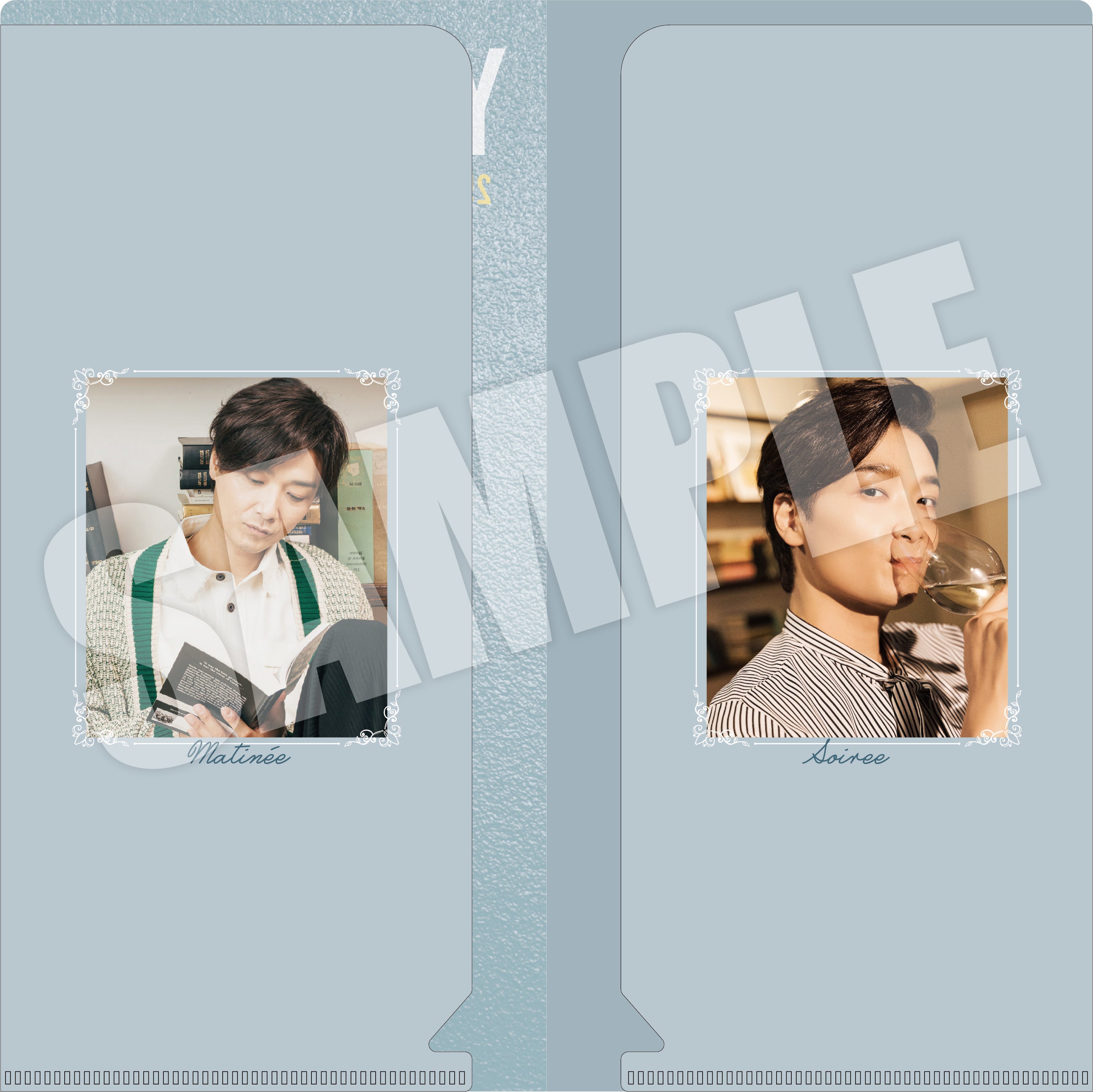 ファンクラブ購入特典は、撮り下ろし写真を使用したオリジナルのダブルチケットホルダーです。表側は表紙カバーのアザーカットを、内側はマチネとソワレをそれぞれイメージしたカットを使用。観劇のお供に活用できること間違いなし!
