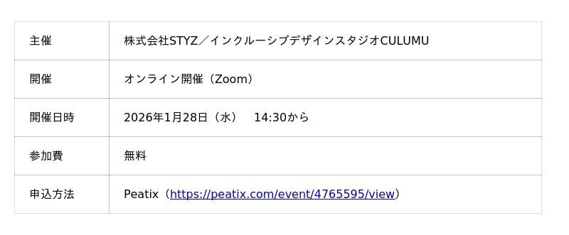 インクルーシブデザインスタジオCULUMU(運営:株式会社STYZ、本社:東京都渋谷区、代表取締役:田中辰也、以下「CULUMU」)は、オンラインセミナーを2026年1月28日(水)14時30分から開催します。