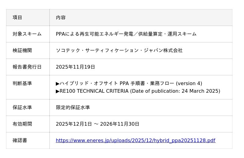 株式会社エナリス(東京都千代田区、代表取締役社長 都築実宏、以下「エナリス」)はこのたび、オリジナルサービスである「ハイブリッド・オフサイトPPAサービス[1] 」の再生可能エネルギー発電/供給量算定・運用スキームについて、「RE100 TECHNICAL CRITERIA 2025」に準拠した設計となっているかを確認・評価する第三者検証を受け、妥当であるとの確認報告書を受領しました。