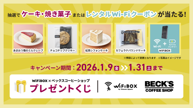 モバイル通信のクロスボーダー・ソリューションを世界規模で提供する株式会社テレコムスクエア(本社:東京都千代田区、代表取締役:吉竹 雄次、以下、当社)は、株式会社JR東日本クロスステーションフーズカンパニー(本社:東京都渋谷区、カンパニー長:中俣 博文)の運営する「ベックスコーヒーショップ」のうちWiFiBOXを設置する33店舗限定で、「WiFiBOX×ベックスくじ」キャンペーンを2026年1月9日(金)より実施いたします。