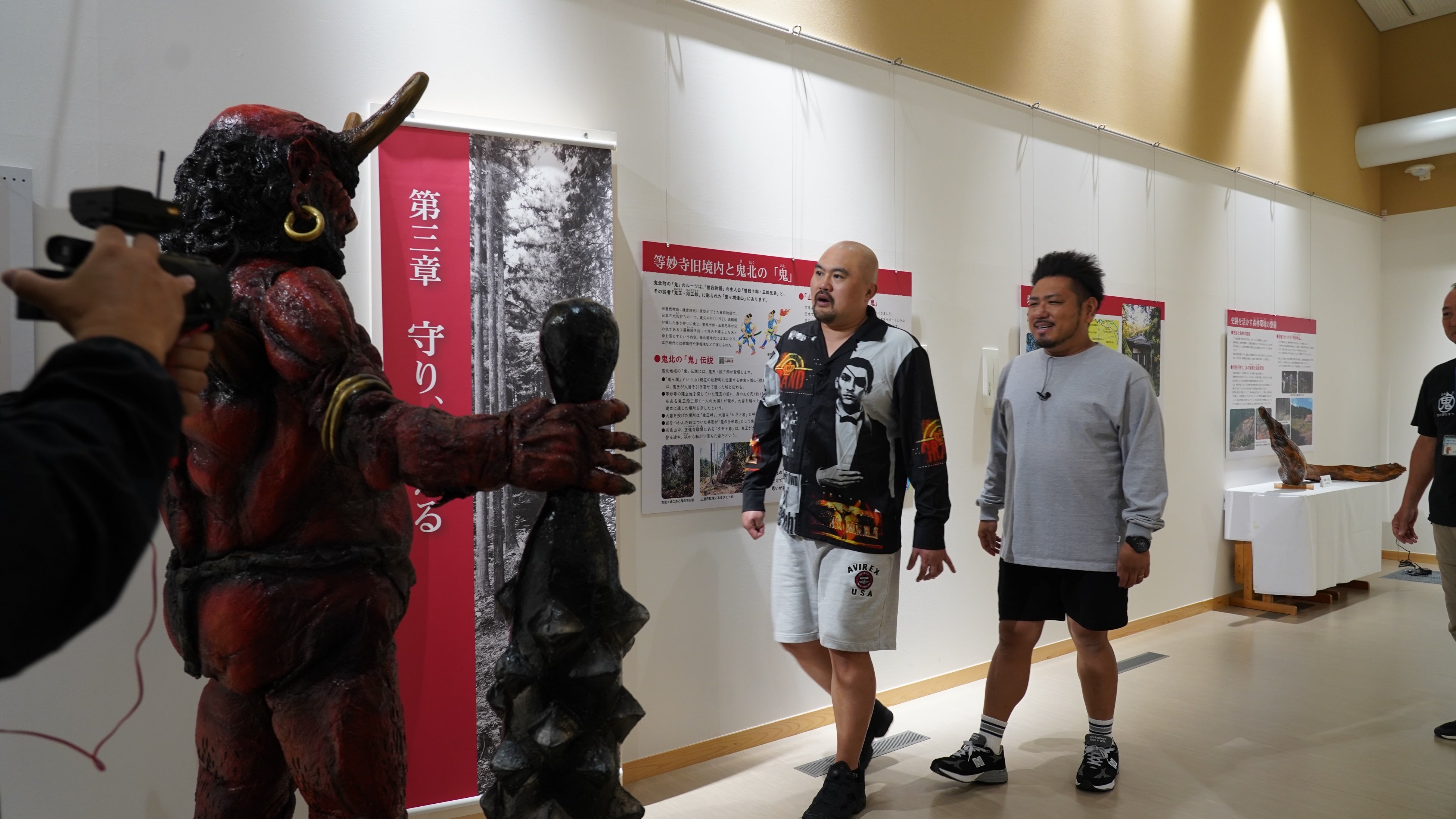 第1弾に続き、二人はサイクリングでスタンプラリー最後のスポット「国史跡 等妙寺旧境内」へ。隣接する「奈良山等妙寺歴史交流館」で鬼北町の鬼伝説を学んでいると、まさかの「鬼王丸」が突然登場。リアルな鬼の姿に驚かされたうえ、鬼王丸が館長の友人だという予想外の事実にも二人は驚きを隠せない様子でした。