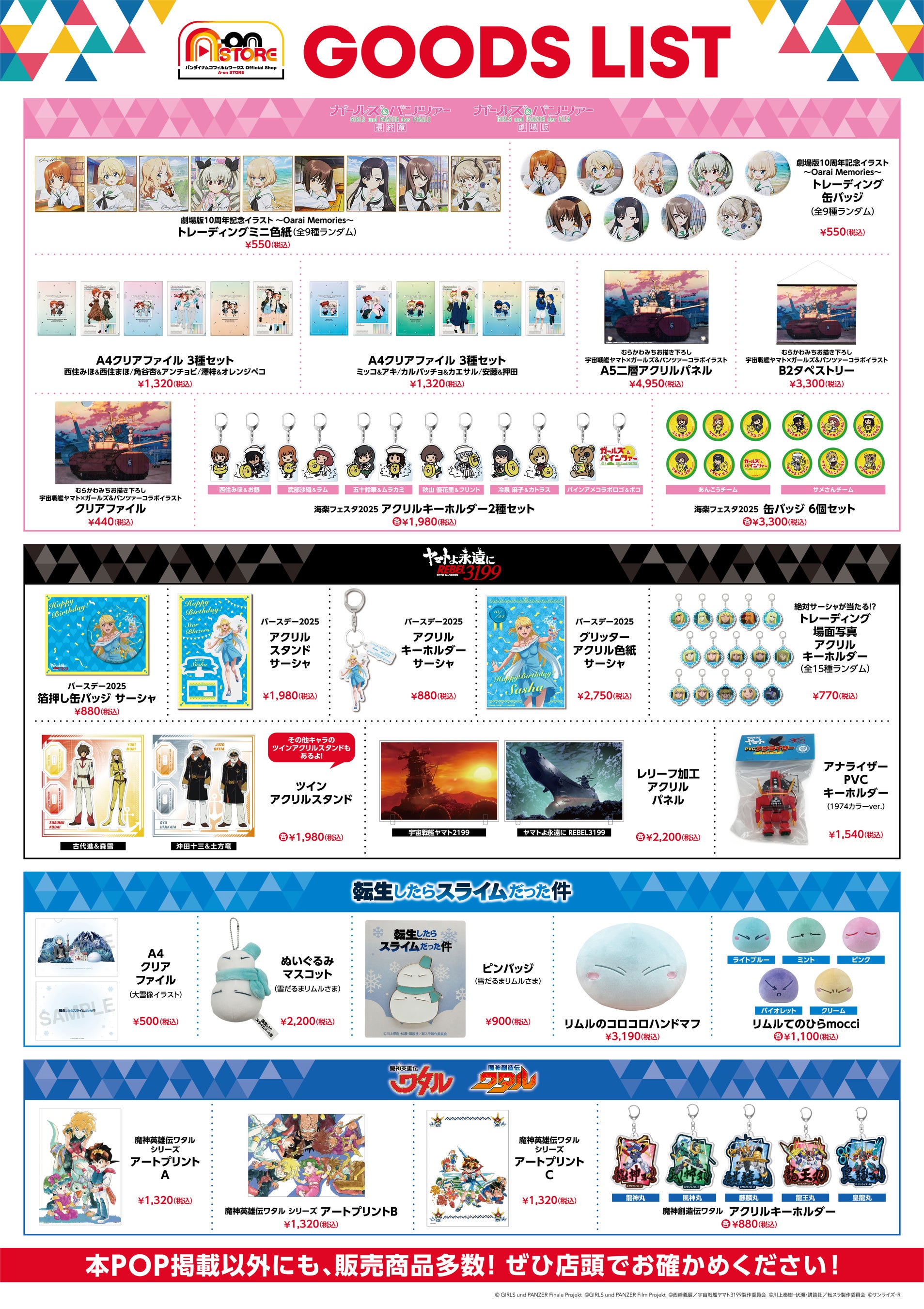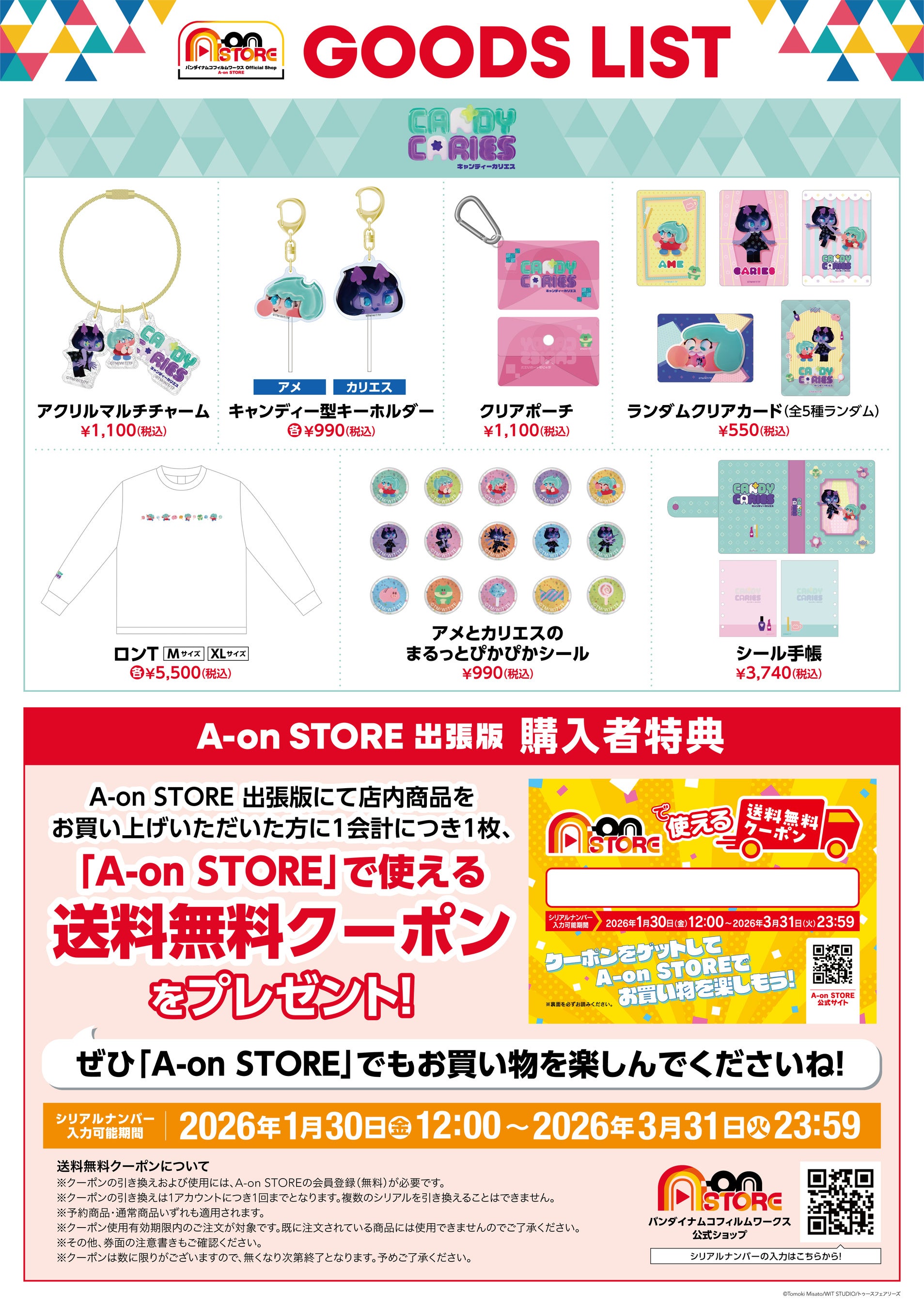 2026年4月より放送&配信予定の新作オリジナルTVアニメ『キャンディーカリエス』の新商品を多数販売するほか、「A-on STORE」にて販売中の『ガールズ&パンツァー 最終章』、『ガールズ&パンツァー 劇場版』、『転生したらスライムだった件』、『魔神英雄伝ワタル』、『魔神創造伝ワタル』、『ヤマトよ永遠に REBEL3199』の関連商品もリアル販売いたします。