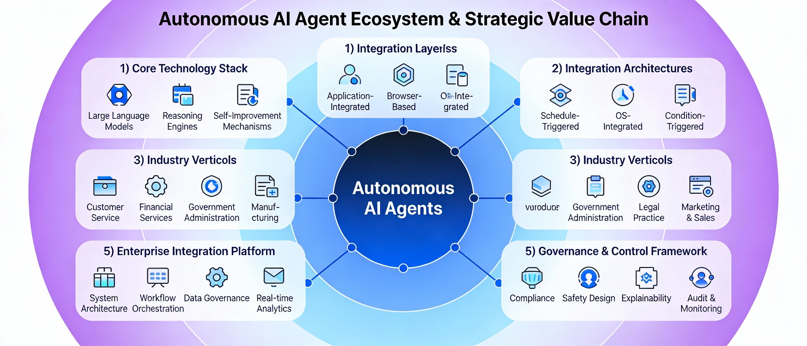 自律型AIエージェントは、単なる自動化ツールから、複雑な環境での意思決定と実行を担う自律的行為主体へと進化している。人間による都度の指示を待つのではなく、目標に基づいて自律的に判断し、外部システムと連携して業務を遂行するアーキテクチャが実装段階に入っている。