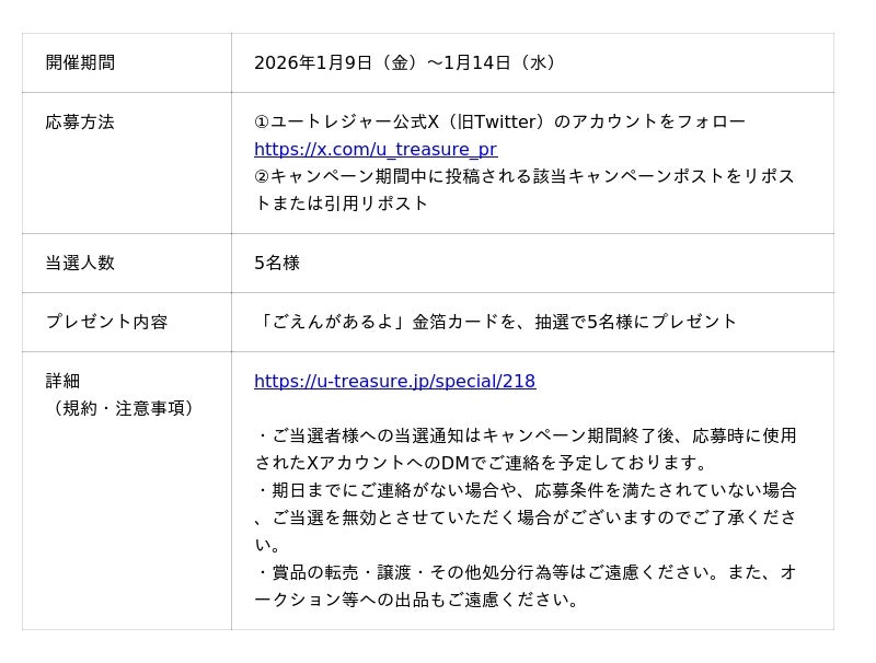[表: https://prtimes.jp/data/corp/37605/table/875_1_b3c2dcb74734ae27d3f0cef4ffdaf914.jpg?v=202601091116 ]ユートレジャーではキャンペーン終了後『「ごえんがあるよ」金箔カード』を2026年1月15日(木)~2月27日(金)の期間限定で予約受け付けを行います。