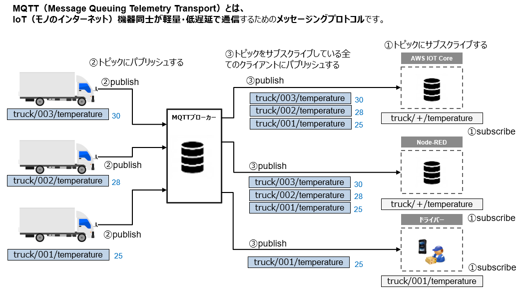 ・ また、必要なトピックだけを受信すればいいのでサーバーサイドのデータの管理や処理が行いやすいこと、デバイスごとに違うトピックを割り振ることができるので機器の管理や機器ごとのセキュリティの割り振りが行いやすいことなどの利点を確認しました。