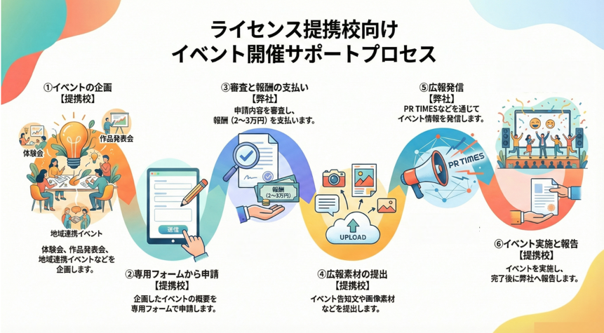 1.イベントの企画(提携校):体験会、作品発表会、地域連携イベントなどを企画します2.専用フォームから申請(提携校):企画したイベント概要を専用フォームから申請します