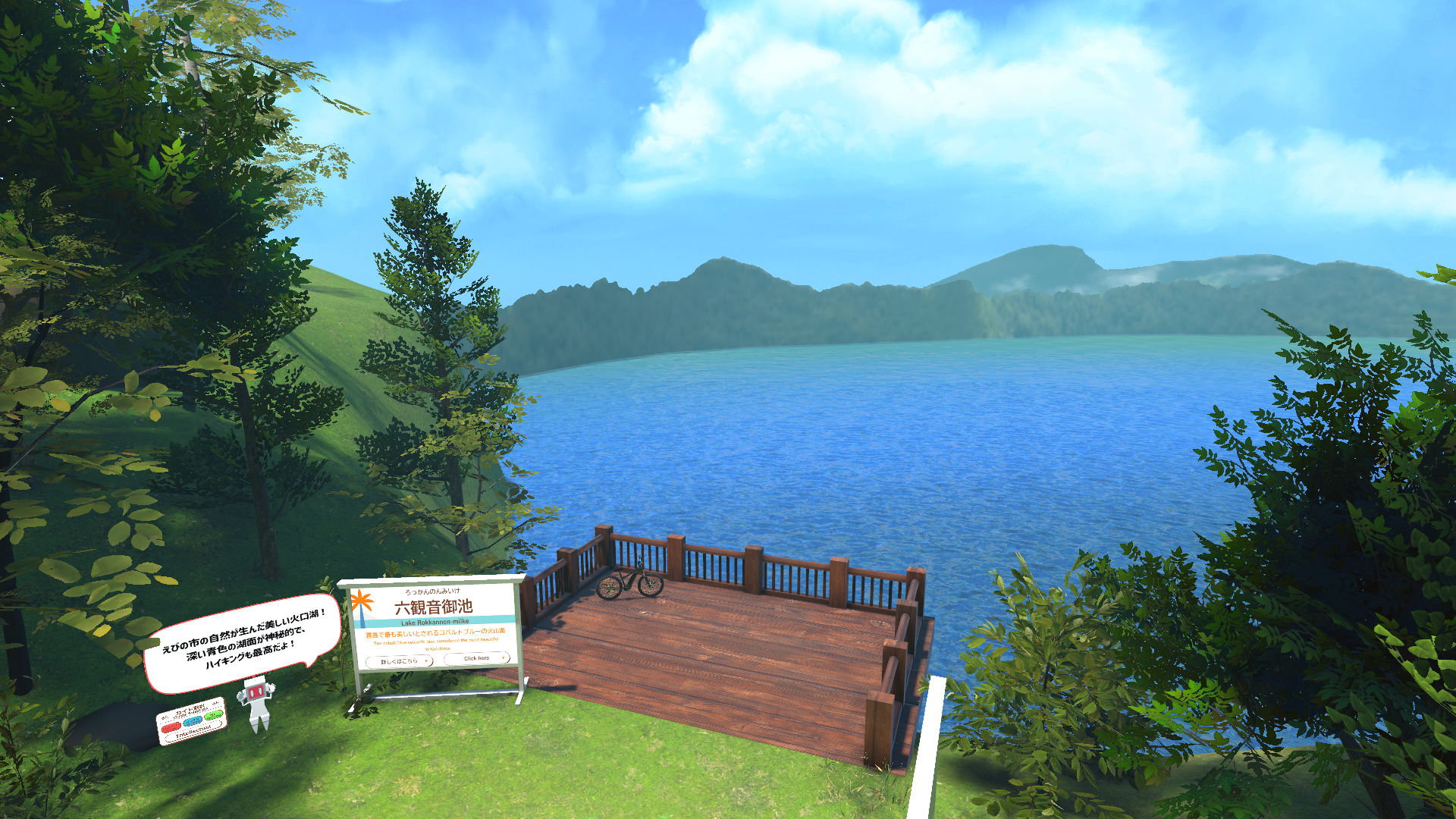 霧島山麓に広がる美しい自然環境を持つ県西エリアを再現したワールドです。生駒高原(小林市)や関之尾滝(都城市)、六観音御池(えびの市)といった観光スポットなど多彩な景観を再現したワールド内を、色をカスタマイズできるEバイクで巡りながら、各地の魅力を体験することができます。また、ワールド内では県西エリア内の象徴的なスポットがオブジェクトとして再現され、県西エリアの様々な魅力に触れながら、ゴールすると「cluster」内で使用できるオリジナルのデジタルアクセサリーがプレゼントされます。