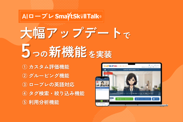 「SmartSkill Talk」は、AIとのリアルな双方向ロープレで実践力を鍛えるサービスです。今回の大型アップデートでは、AIが自社独自の合格基準で多面的にフィードバックを行う「カスタム評価機能」を実装しました。本機能により、自社が重視する商談の「軸」を実践さながらの対話で磨くことが可能になります。さらに、部署ごとに環境を最適化する「グルーピング機能」や、グローバル環境を再現する「英語対応」、必要な練習を即座に選べる「タグ検索」、成長を可視化する「利用分析」を組み合わせることで、現場の「手軽さ」を維持しながら、組織の壁を超えて一人ひとりの「商談適応力」を最大化させるパーソナライズ化を実現しました。