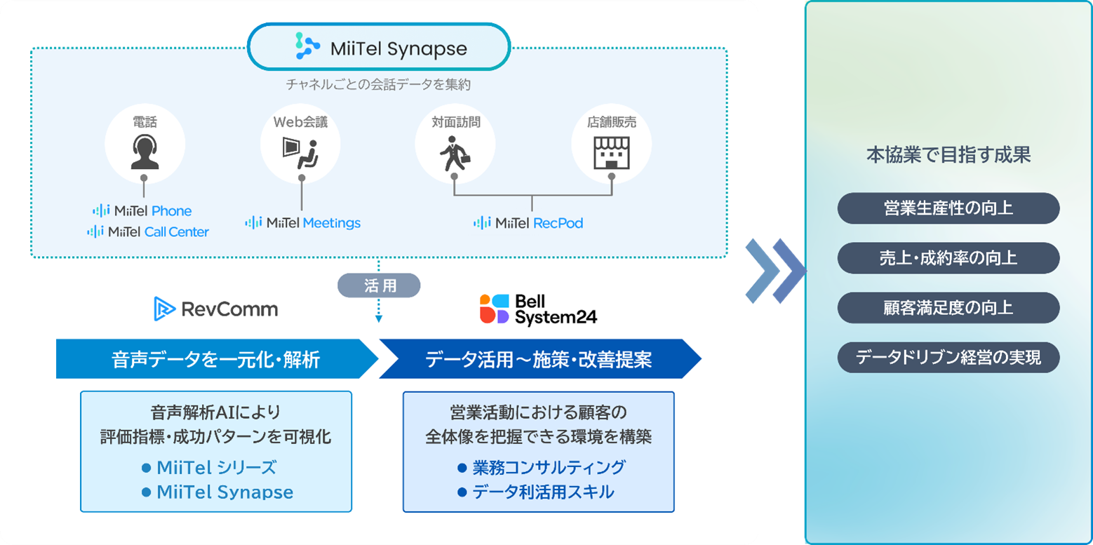 レブコムが提供する音声解析AI「MiiTel」シリーズは、電話やWEB会議、対面訪問、店舗販売といった営業におけるあらゆる顧客接点の会話をデータ化し、データ集約による一元管理や分析が可能になります。本協業では、「MiiTel」シリーズを基盤に、ベルシステム24が持つ業務コンサルティングやデータ利活用のスキルを組み合わせることで、データに基づいた営業活動における顧客の全体像を把握できる環境を構築し、営業のデータ活用を支援する共同サービスを提供予定です。リアル・オンラインの垣根を超えて営業活動で発生したコミュニケーションデータを一気通貫で利活用できる点が特徴で、これにより、営業現場の生産性向上、売上拡大、顧客満足度向上に直結する改善策を提供するとともに、経営判断に活用できるデータドリブンな仕組みを実現します。