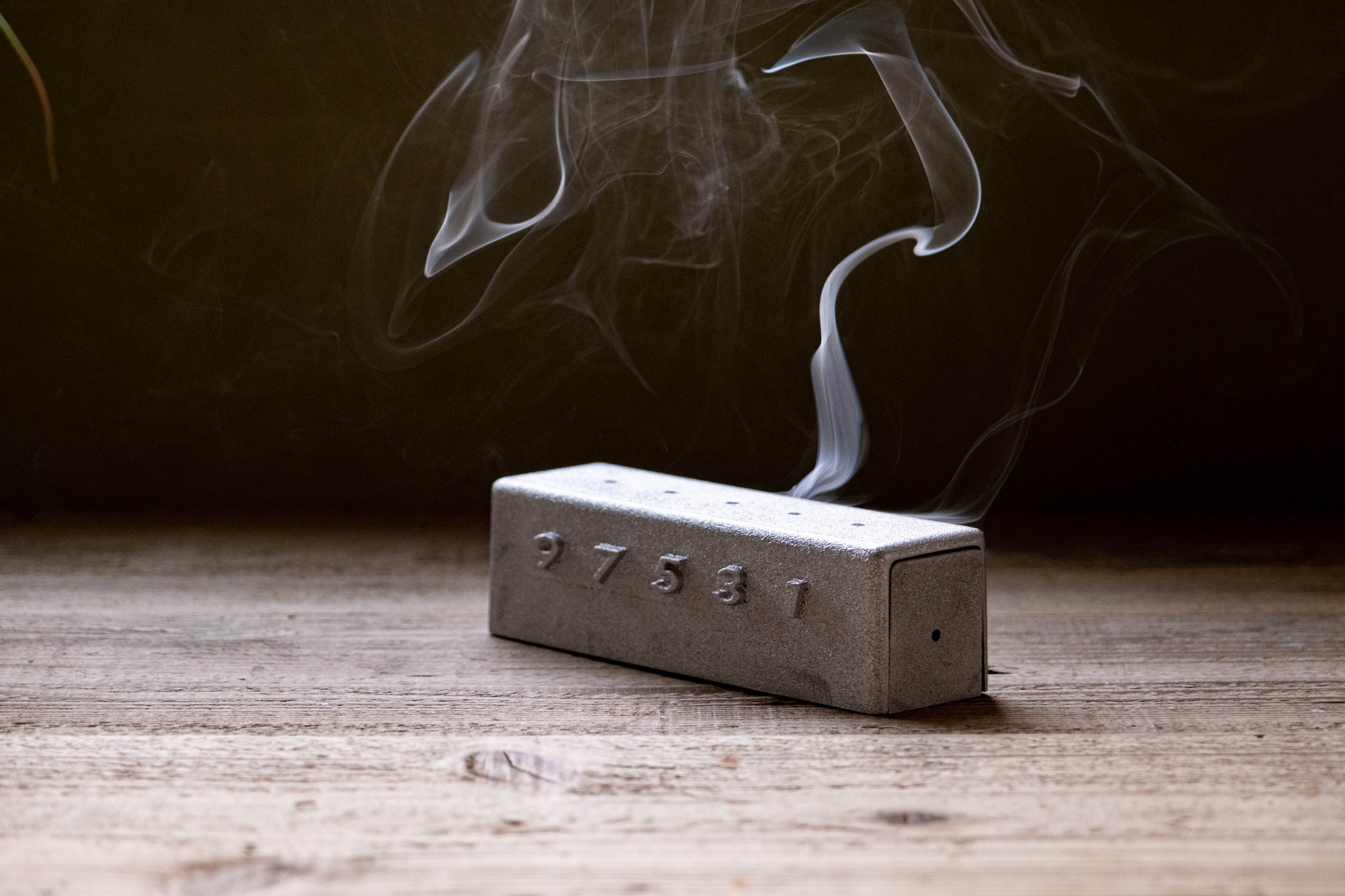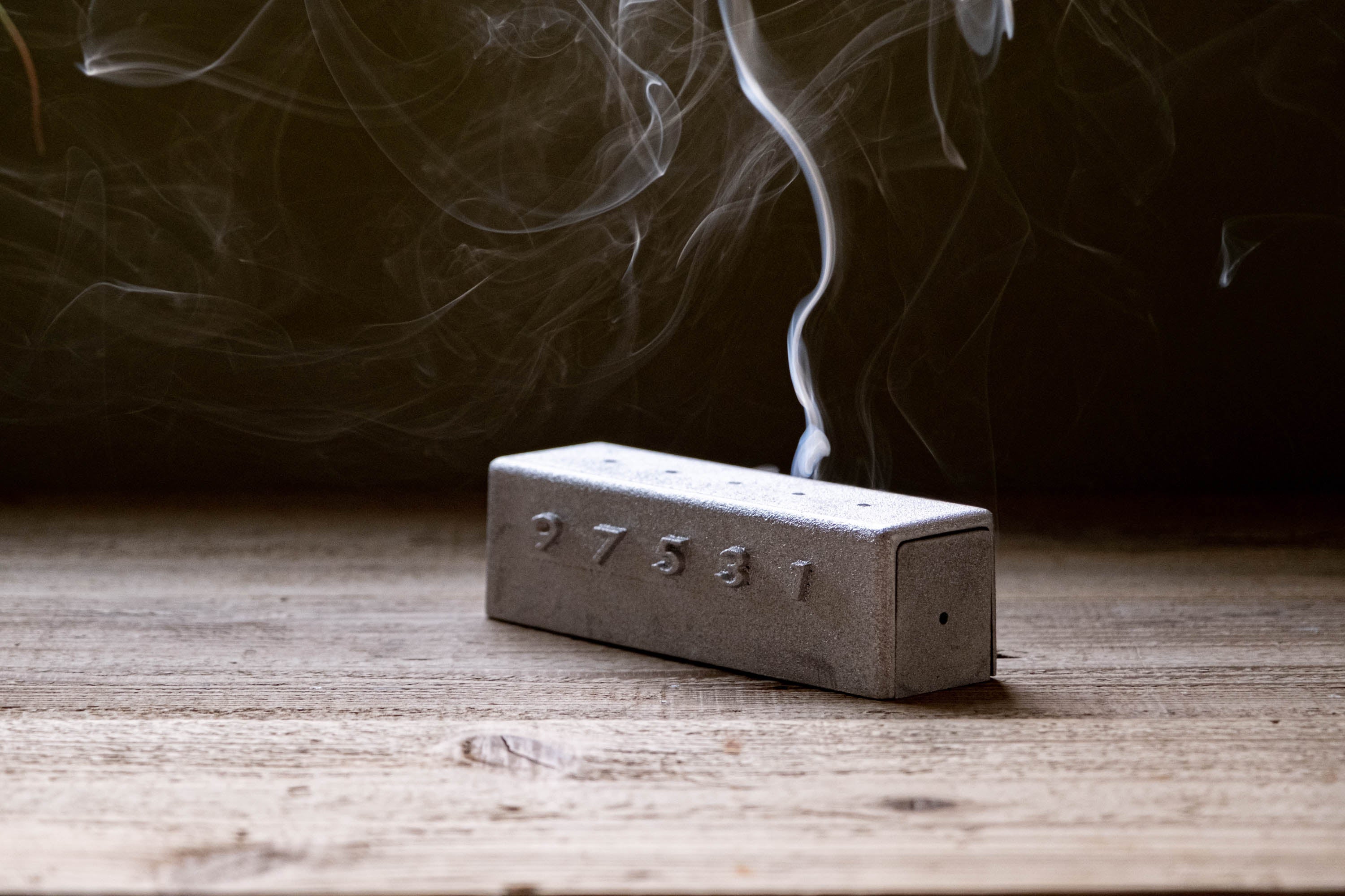 デザインと「時間」の可視化受け台の穴にお香を横に挿しこみ、火を付け蓋をかぶせると上の穴から煙が出てきます。煙の出る穴の真下にある9~1の数字はお香の長さの割合を表しており、中が見えない状態で燃え進んでも