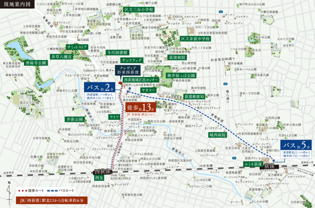 「クレヴィア杉並西荻窪」は、JR中央線「西荻窪」駅と「荻窪」駅の2駅3路線利用可能で、「荻窪」駅は、東京メトロ丸ノ内線の始発駅のため、都心の様々な駅へ快適に行くことができます。本物件から徒歩2分のバス停から「荻窪」駅、「西荻窪」駅へのスムーズな移動が可能で、駅までのアプローチも快適です。
