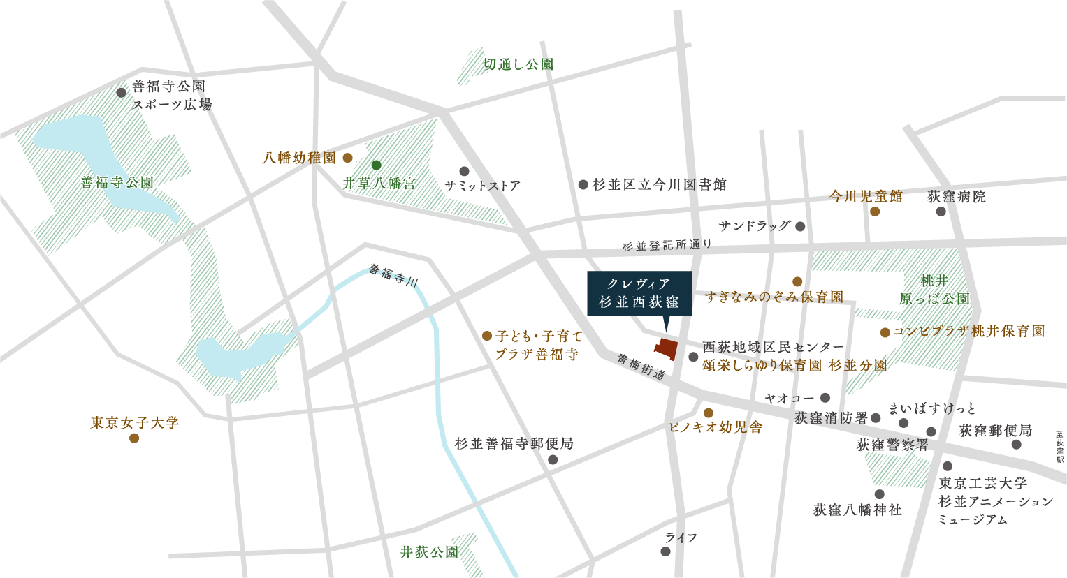 杉並・荻窪は、かつて、文化人・作家たちが居を構えた東京近郊の別荘地としての歴史があり、その名残は今なお、成熟した緑とともに街に溶け込んでいます。自然豊かな公園や善福寺川沿いを彩る桜並木をはじめ、四季折々の表情を織りなす自然風土が、落ち着きと豊かさを表すエリアです。ゆったりと穏やかな住環境と生活利便性を兼ね備えたポジションで、荻窪と西荻窪の駅前には商業施設や商店街などが揃うほか、最寄りのスーパーまで徒歩5分という便利なロケーションです。周辺には、広大な芝生広場がある「桃井原っぱ公園」や、武蔵野三大湧水の善福寺池を擁する「都立善福寺公園」などがあり、緑豊かな杉並の公園や自然を存分に楽しめる住環境です。