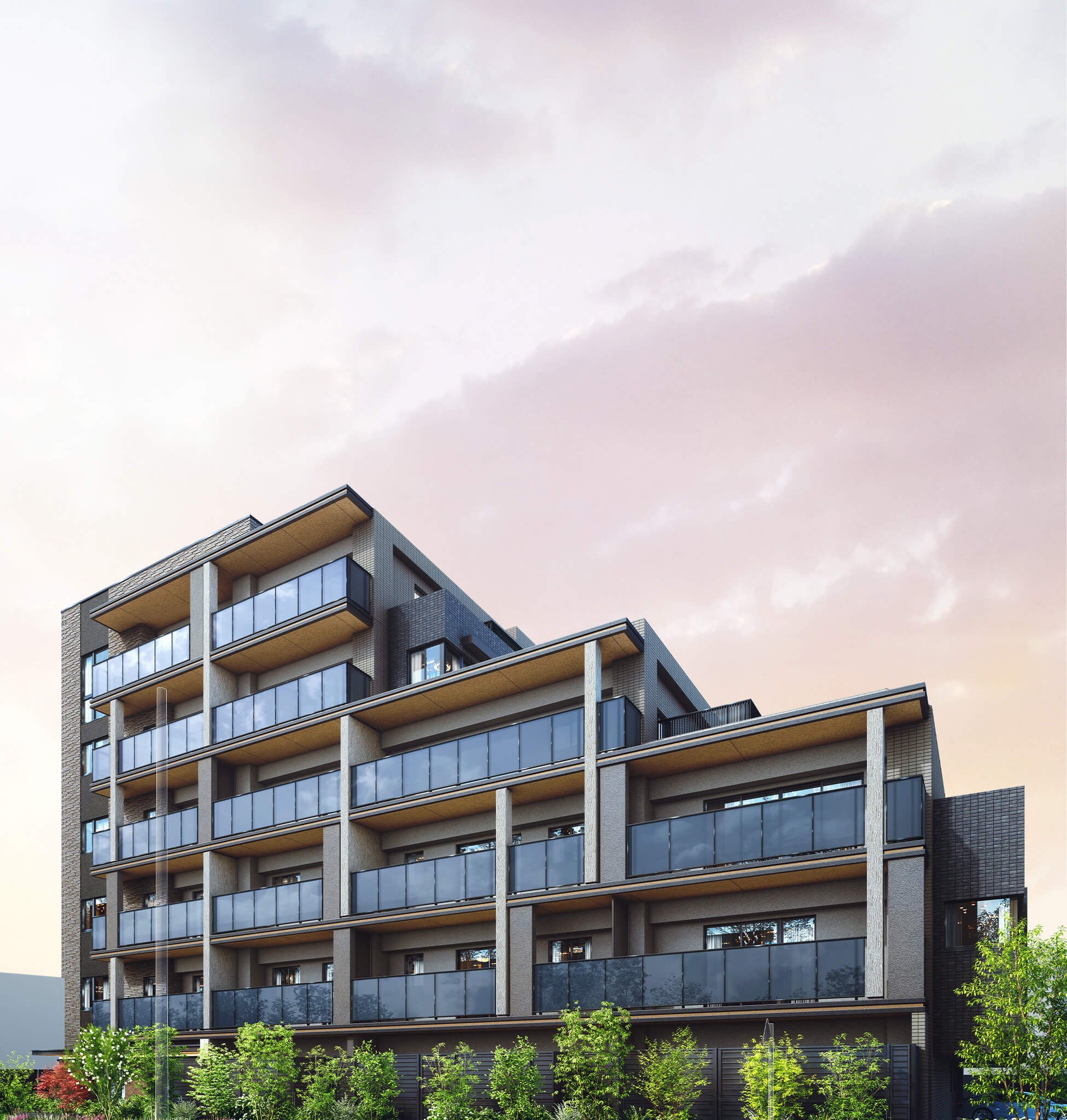建物の外観は、グレーとアースカラーを基調に、手作り感や素材感のあるマテリアルを使用することで、落ち着いた街並みに調和しながらも存在感のあるデザインとしました。バルコニーの水平ラインを二重に強調したファサードと、ランダムに配した2種類のマリオン、シャープなガラスの手すりを組み合わせ、端正でありながらも柔らかさを感じる表情を創出。豊かな植栽を配したエントランスアプローチは、静かな佇まいと格調の高さを感じる空間に仕上げました。