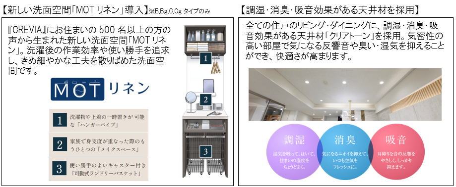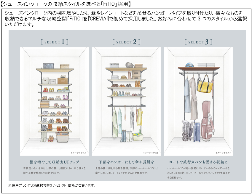 本物件では、『CREVIA』として初めてウルトラファインバブル給湯器を標準搭載。さらに、シューズインクロークを靴の収納場所としてだけではなく、多目的に使える収納空間にできるよう、3つのスタイルから収納を選べる「FiTIO」採用など、暮らしがより豊かになる住まいをめざしました。