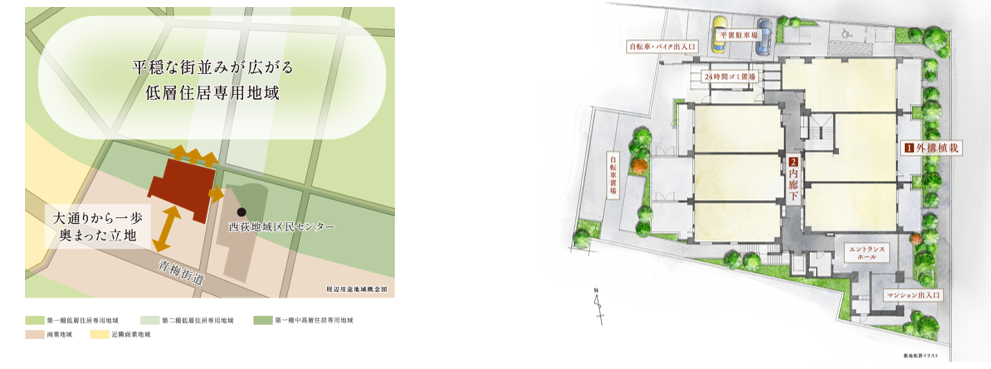 本物件は、青梅街道から一歩奥まった角地で、敷地の北側は低層住宅街に隣接しているため、穏やかな環境と開放感を享受できる立地です。敷地東側の歩道状空地や外構には、周辺の公園や街路樹との連続性を意識して植栽を配し、建物と街と自然が心地よく繋がり、より豊かになる空間を創出しました。