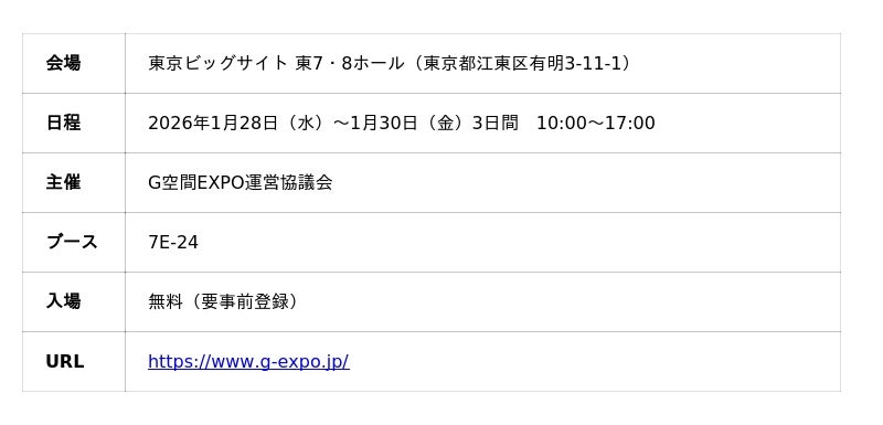 [画像5: https://prcdn.freetls.fastly.net/release_image/164945/6/164945-6-0101600b1a0ccf3ed249ee4ce85f1df7-2000x971.jpg?width=536&quality=85%2C75&format=jpeg&auto=webp&fit=bounds&bg-color=fff ]G空間EXPO2026