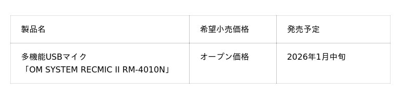 OMデジタルソリューションズ株式会社(代表取締役社長 兼 CEO:杉本 繁実)の産業・学術分野向けソリューションを展開する「OMイノテックス」は、多機能USBマイク「OM SYSTEM RECMIC II RM-4010N」を、2026年1月中旬より、日本国内において販売を開始いたします。本製品は、「話す」「聞く」「入力する」「操作する」を片手で完結できる多機能設計を採用。音声認識とキーボード入力の両方を組み合わせることで、多彩で効率的な情報入力を実現します。これにより、ビジネスシーンにおけるワークフローの最適化と生産性の向上を強力にサポートします。