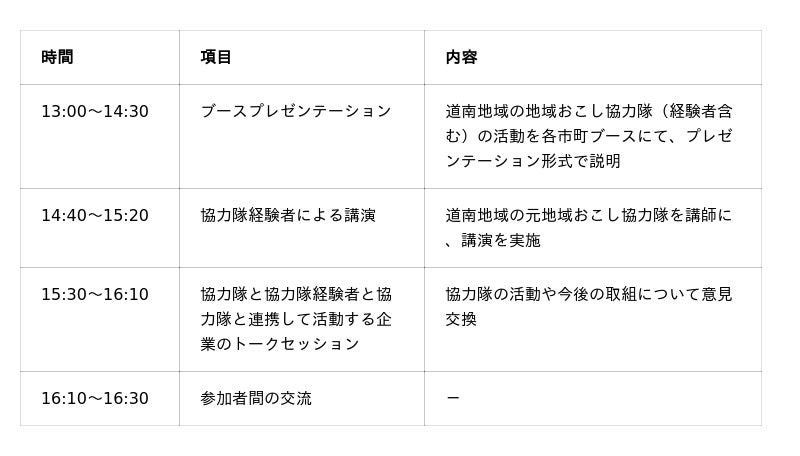 渡島総合振興局では、各市町の地域おこし協力隊員の活動や取組を広く地域の関係企業・団体等に周知し、今後の協力隊活動の活性化を図るためのイベントを開催します。