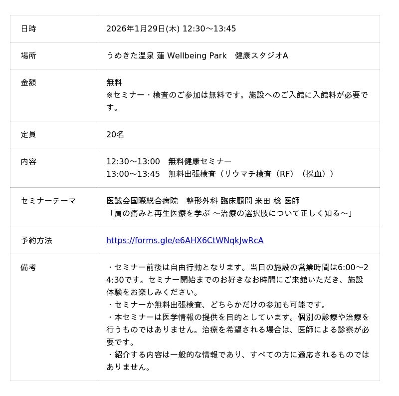 「うめきた温泉 蓮 Wellbeing Park」(総支配人:藤立 達哉、所在地:大阪市)は、2026年1月29日に、提携医療機関である医療法人医誠会(代表者:谷 幸治、本社:大阪市)の「医誠会国際総合病院」と共同で、第9回健康セミナーを開催することをお知らせします。