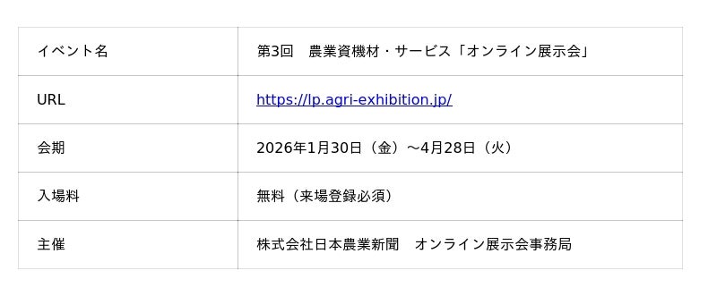 当社は、中期経営計画NX2028で「新領域への展開」を基本戦略の一つとし、新たな市場への挑戦を進めています。その一環として、日本農業新聞主催の「第3回 農業資機材・サービスオンライン展示会」に出展します。本展示会は、農業従事者や関連企業、自治体向けに、農業に役立つ資機材やサービスを紹介するオンラインイベントで、全国どこからでも参加でき、最新の技術や製品情報を得ることができます。当社ブースでは農業現場の課題解決に貢献する製品を紹介し、アンケートを通じて新製品へのご要望も募集しております。皆様の貴重なご意見を製品開発に活かしてまいりますので、ご協力のほどお願い申し上げます。「世の中の“キレイ”を支える会社」として、農業界の課題解決に貢献してまいります。皆様のご来場を心よりお待ちしております。