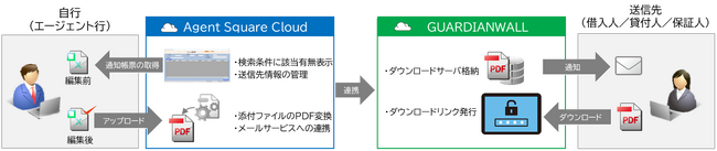 「Agent Square Cloud」から出力した帳票(Excelシート)はPDF形式に変換され、ダウンロードリンクとして送信先に通知されます。受信者は安全なダウンロードサイトから帳票を取得可能です。