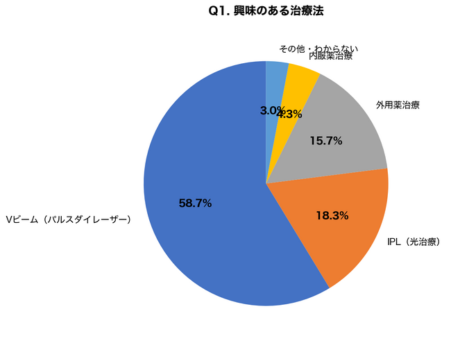 Vビームレーザーへの関心が圧倒的に高く、約6割の方が興味を示しています。SNSでの体験談や即効性への期待が背景にあると考えられますが、実際の治療選択では費用や適応症状を慎重に検討する必要があります。