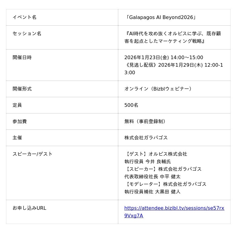 AIトランスフォーメーションで業務改革を支援する株式会社ガラパゴス(本社:東京都千代田区、代表取締役社長:中平健太)は、2026年1月23日(金)にオンラインウェビナー「【AI時代を攻め抜く】オルビスに学ぶ、既存顧客を起点としたマーケティング戦略」を開催することをお知らせします。本セッションでは、独自のブランド体験とCRM戦略で高収益体質を実現している「オルビス」の事例を起点に、既存顧客の売上を伸ばすための具体的なメカニズムを紐解きます。