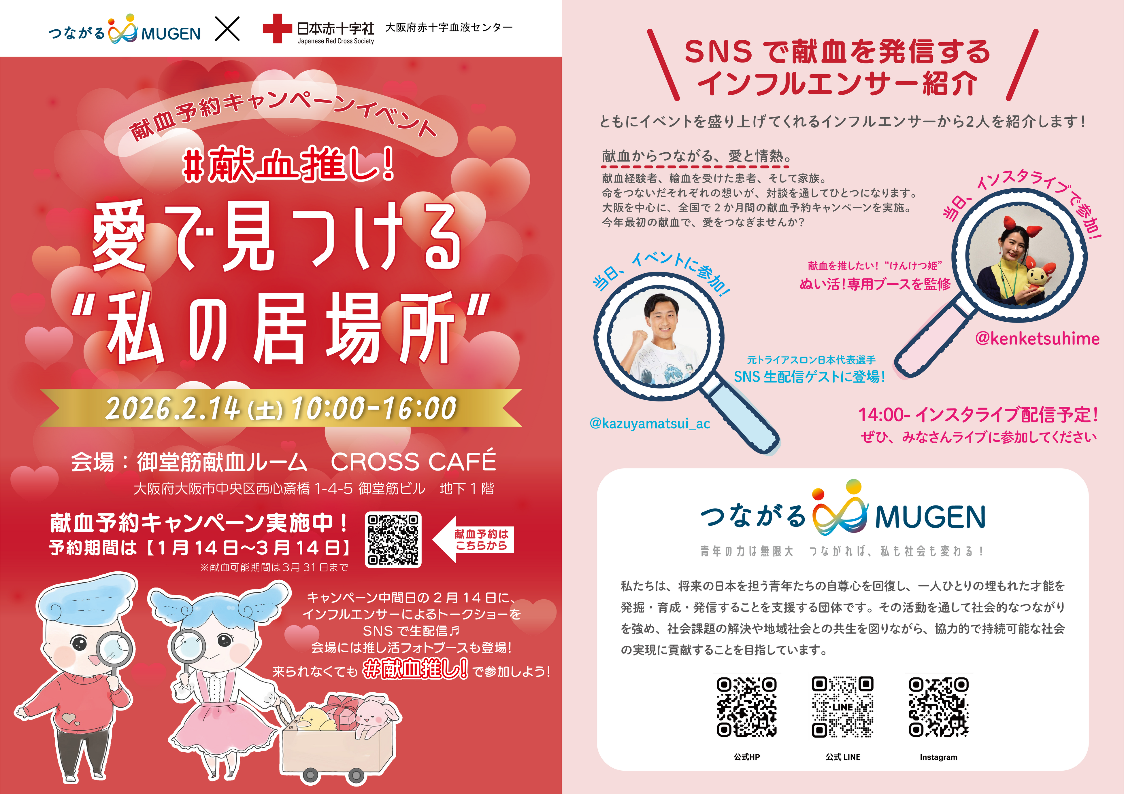 青年団体「つながるMUGEN」(所在地:大阪)は、2026年2月14日(土)、大阪・御堂筋献血ルーム CROSS CAFEにて、献血イベント「#献血推し! 愛で見つける“私の居場所”」を開催します。本イベントは、2025年7月に森ノ宮キューズモールで開催した第1回献血啓発イベントに続く、第2回目の開催です。