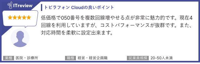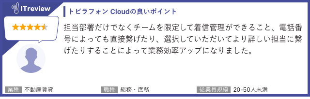 「トビラフォン Cloud」は「ITreview」で平均顧客満足度4.3を獲得しています(2026年1月21日時点 91レビュー)。当製品のご利用者様から実際に寄せられたレビューを一部ご紹介します。[画像3: https://prcdn.freetls.fastly.net/release_image/34282/210/34282-210-94e7dd4f9771d610209254759ecb7635-640x205.png?width=536&quality=85%2C75&format=jpeg&auto=webp&fit=bounds&bg-color=fff ]