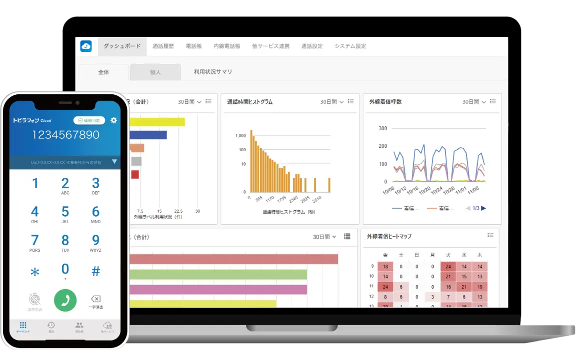 「トビラフォン Cloud」は、機器設置や工事が不要で使えるクラウド型ビジネスフォンです。スマホアプリやPC、IP電話機等のマルチデバイスに対応しており、働き方に合わせた電話環境を実現します。「050」で始まるIP電話番号の他、市外局番やフリーダイヤルなど、用途に合わせた番号の新規発行、または既存番号の引き継ぎが可能です。外線・内線・転送等の通話機能だけでなく、録音・IVR(自動音声応答)・通話の文字起こしなど、電話業務を便利にする機能を標準搭載。SalesforceやHubSpot、kintoneなど様々な外部ツールと連携でき、架電内容の記録や連絡先の管理を効率化します。また、AIによる通話内容の要約や、通話履歴に対するラベルの自動付与も活用することで、通話内容を端的に把握できます。