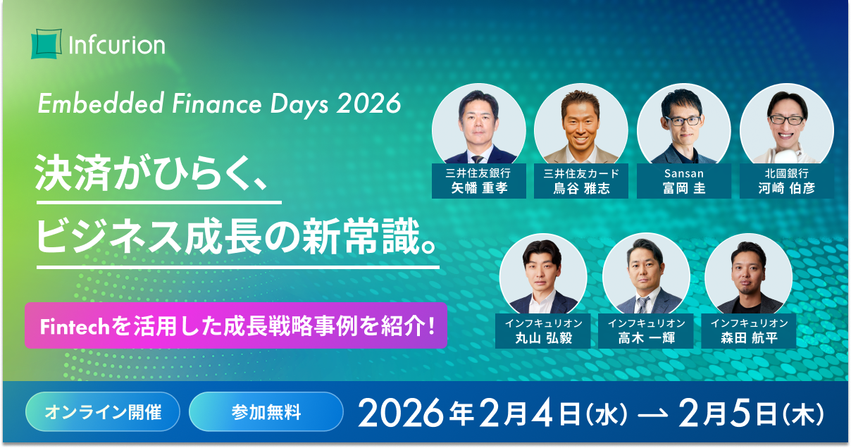 株式会社インフキュリオン(本社:東京都千代田区、代表取締役社長CEO 丸山弘毅、以下「インフキュリオン」)が、Embedded Finance(エンベデッド・ファイナンス/組込型金融)(※1)をテーマに、2026年2月4日(水)および2月5日(木)の2日間にわたり開催するオンラインイベント「Embedded Finance Days 2026」の追加登壇者をお知らせします。
