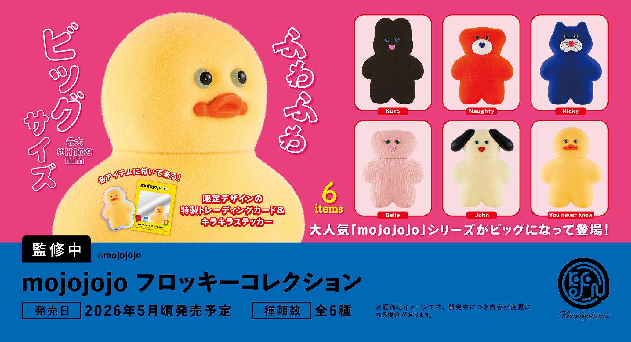 アート雑貨メーカーの株式会社ケンエレファント(本社:東京都千代田区、代表取締役社長:石山健三)は、ぬいぐるみ作家・尾崎歩美氏の大人気mojojojoシリーズ最新作となるビッグサイズのフロッキーフィギュア「mojojojo フロッキーコレクション」を、2026年5月に発売いたします。それに先駆け、予約を開始いたしました。