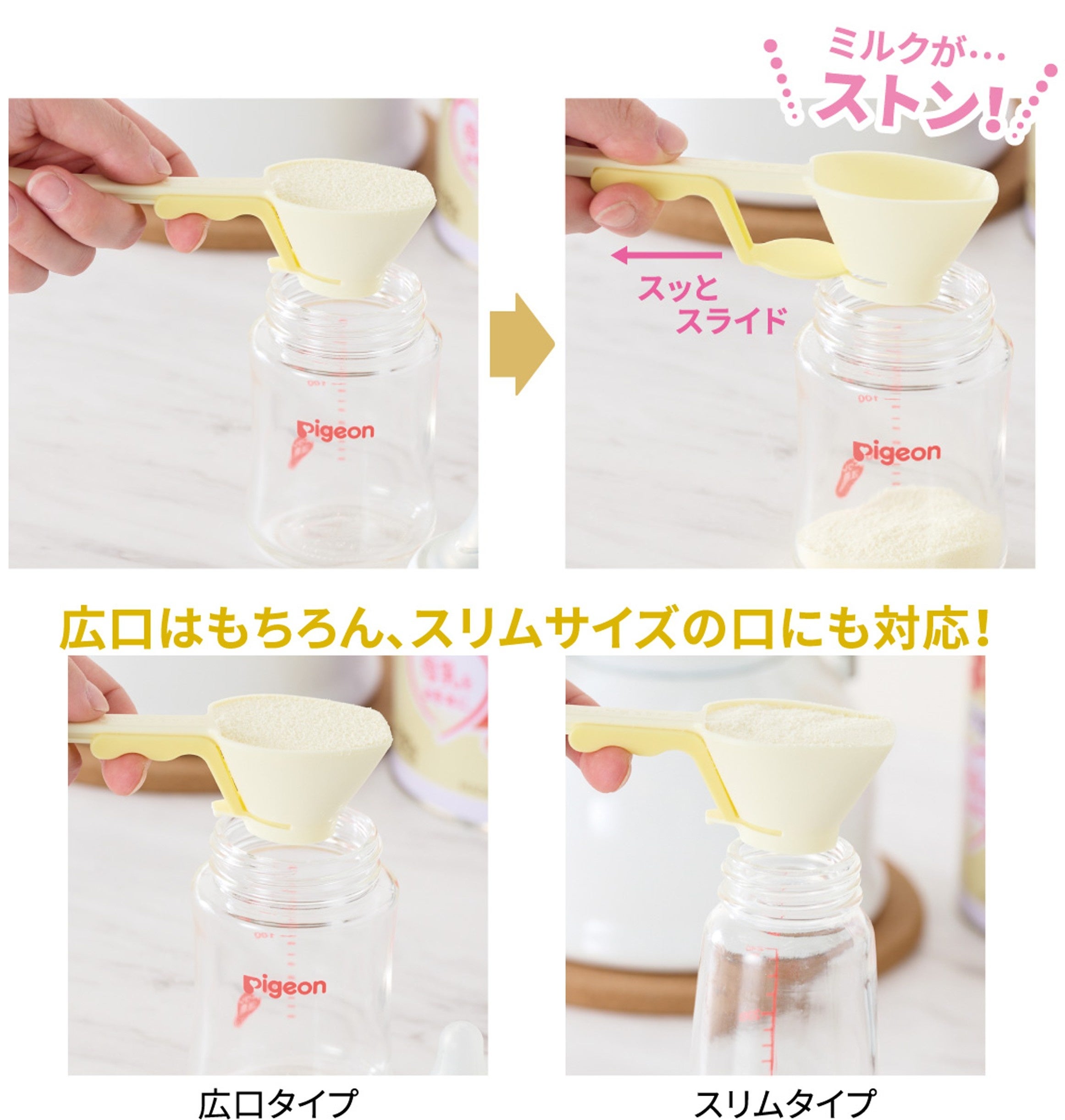 粉ミルクをすくったら、ほ乳びんの上で底を引いて落とすだけ。スプーンをひっくり返す必要がなく、こぼれにくいので便利です。